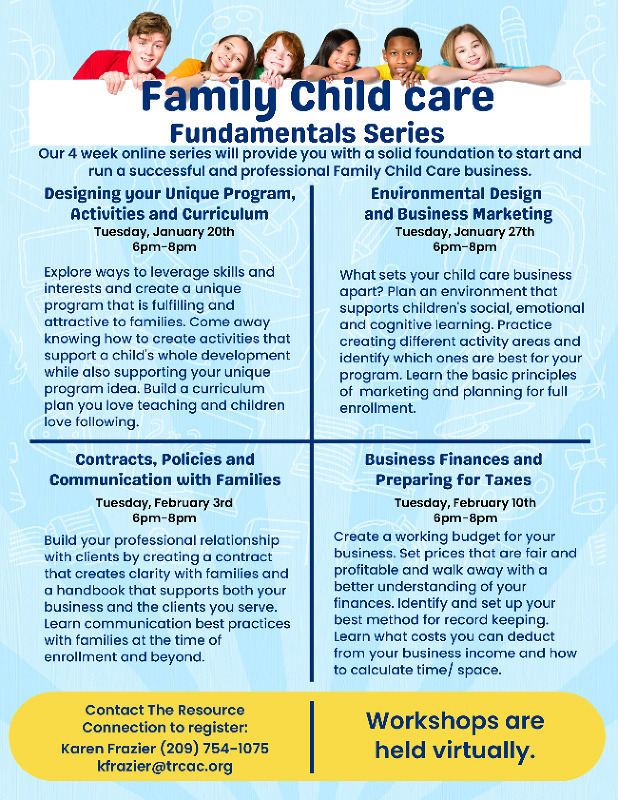 ** Register for Workshops/trainings through the CA ECE Workforce Registry Click here to learn how to sign-up and register for workshops. To receive credit, please submit your Workforce Registry number to snoble@trcac.org.